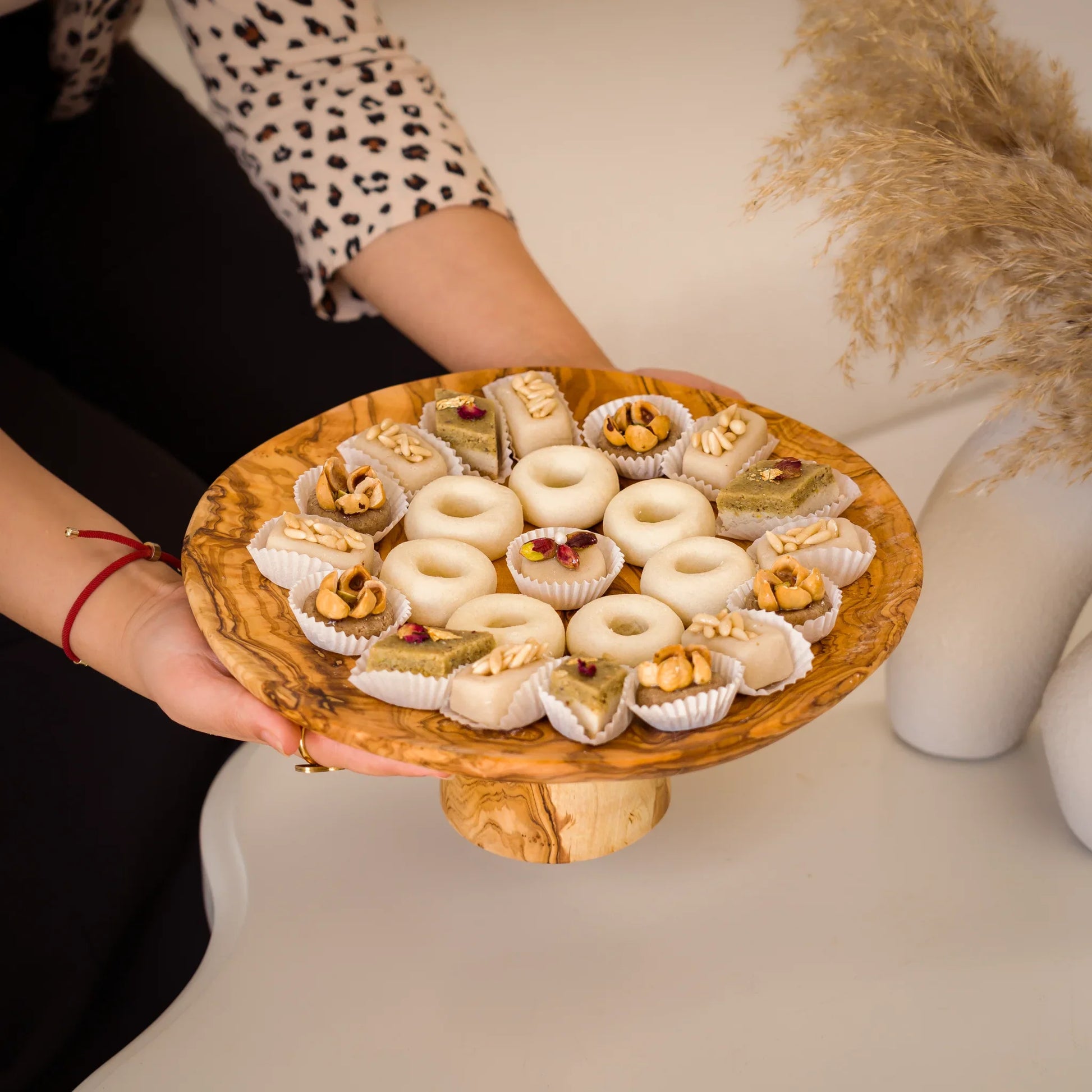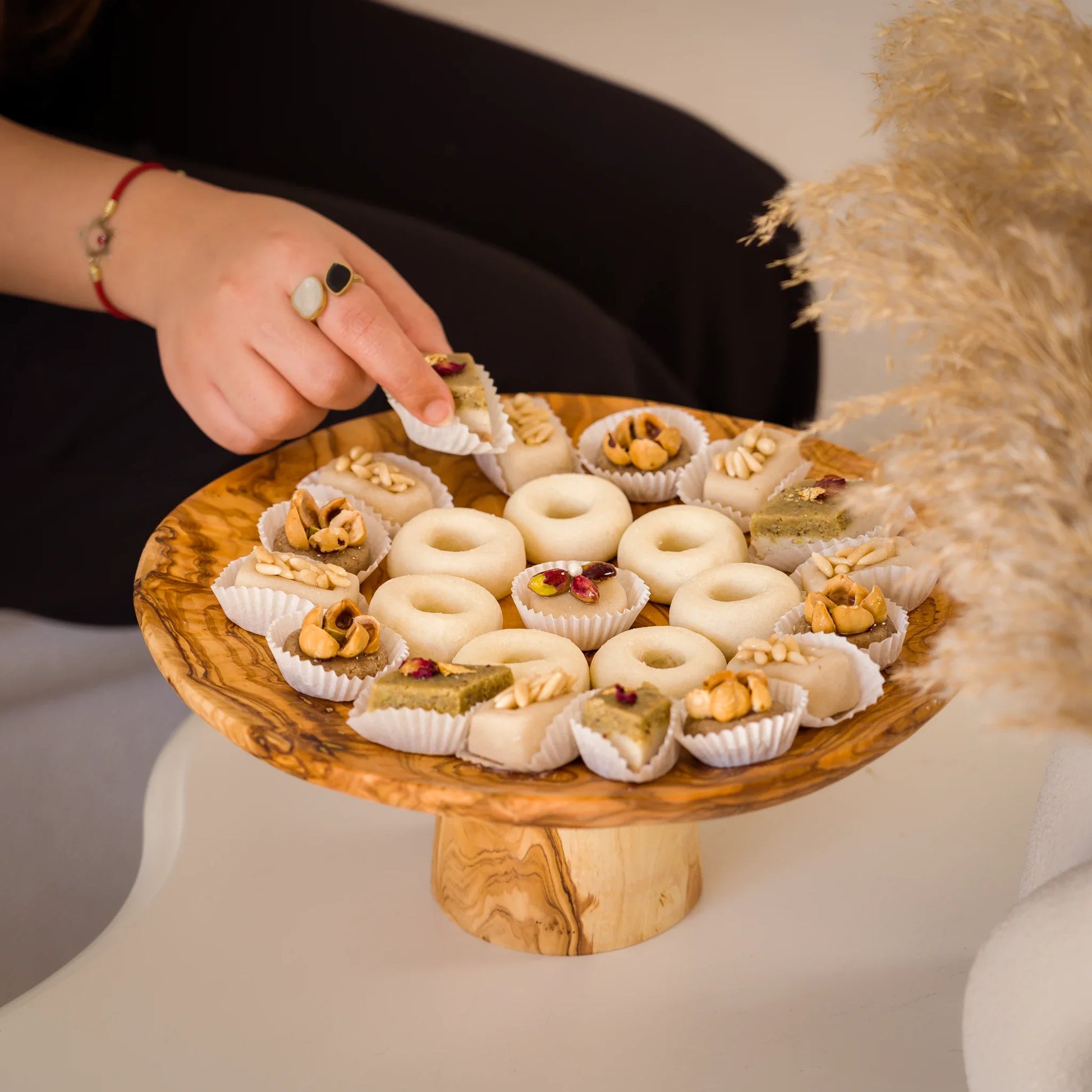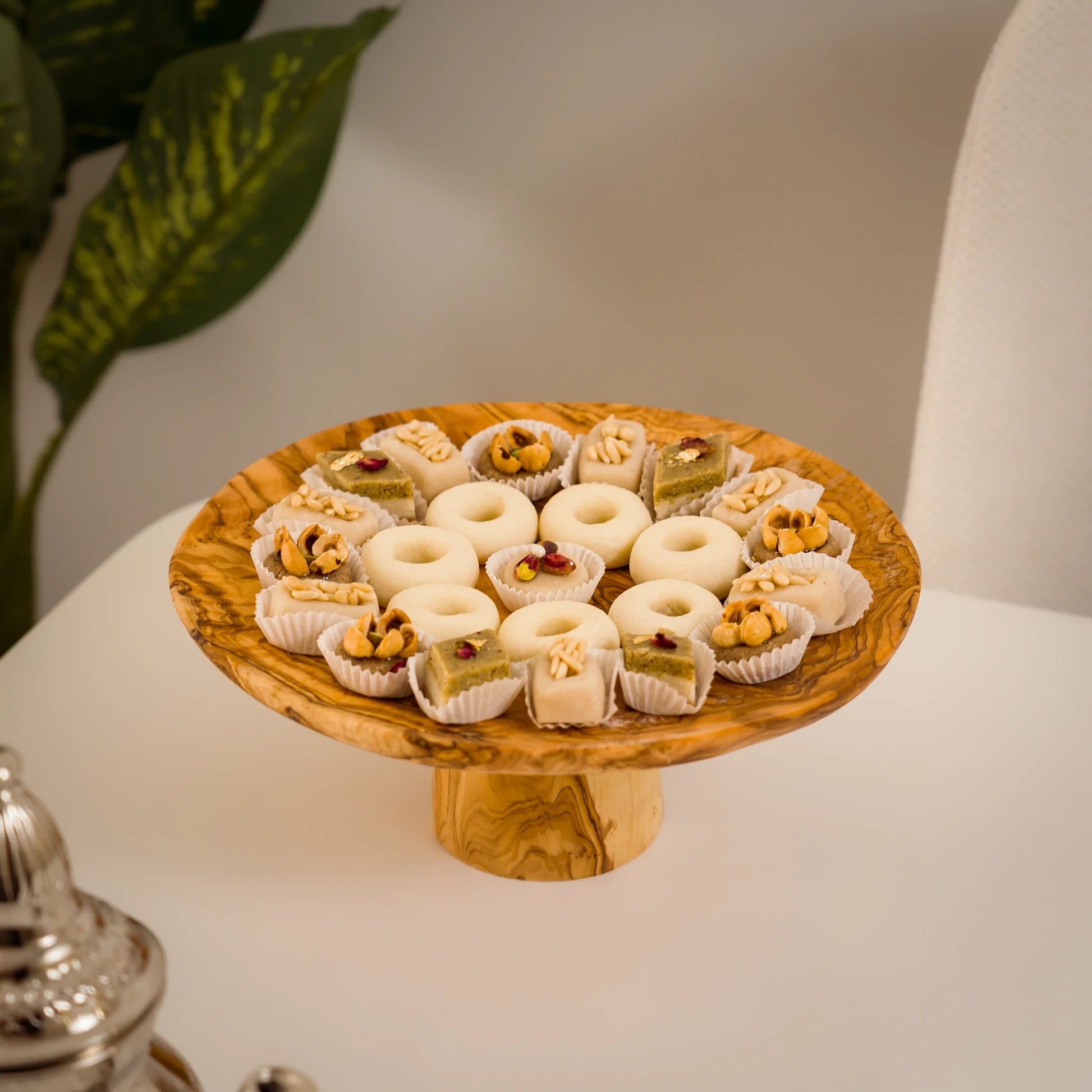 Apportez une touche d’authenticité et de raffinement à vos tables avec le présentoir OLMA, Sculpté dans du bois d’olivier de qualité supérieure, chaque pièce est unique grâce aux nervures naturelles du bois. Ce support sur pied sublime vos pâtisseries, fruits secs, fromages ou bouchées apéritives