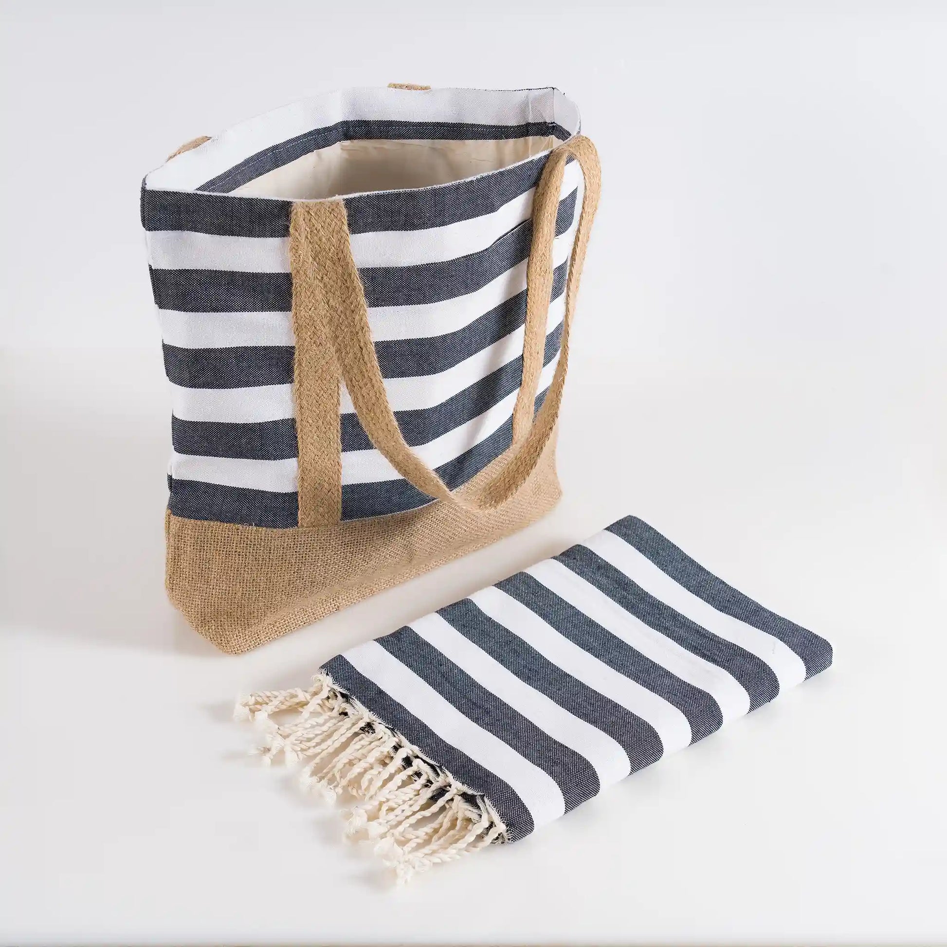 Préparez-vous à briller sur la plage avec notre sac de plage isotherme livré avec une fouta assortie. Fabriqué avec des matériaux naturels et durables, ce sac au design rayé allie style, praticité et conscience écologique
